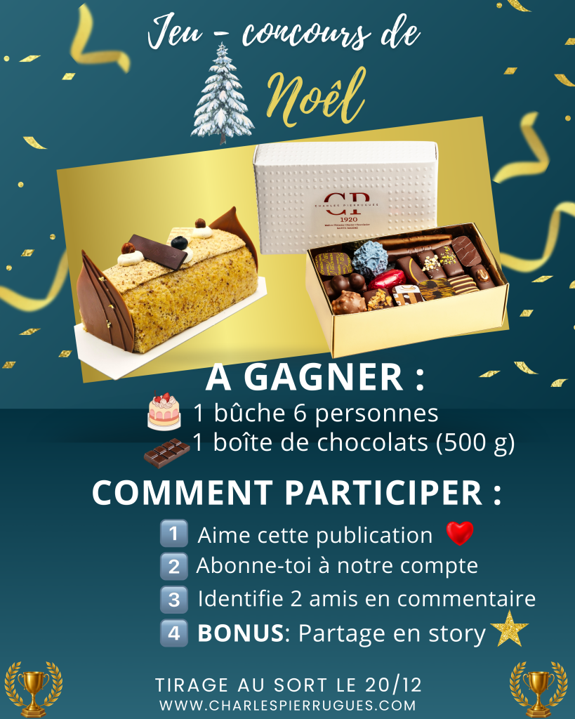 Tentez de remporter une bûche 6 personnes de votre choix ainsi qu’une boite de 500 grs de chocolats