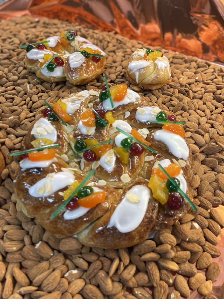 Découvrez l’élégance d’une brioche feuilletée dorée, délicatement garnie d’une crème onctueuse aux amandes de Provence, rehaussée d’une subtile pointe de rhum et décorée de fruits confits pour une touche colorée et festive. Un hommage aux saveurs d’antan revisitées avec une touche de modernité.