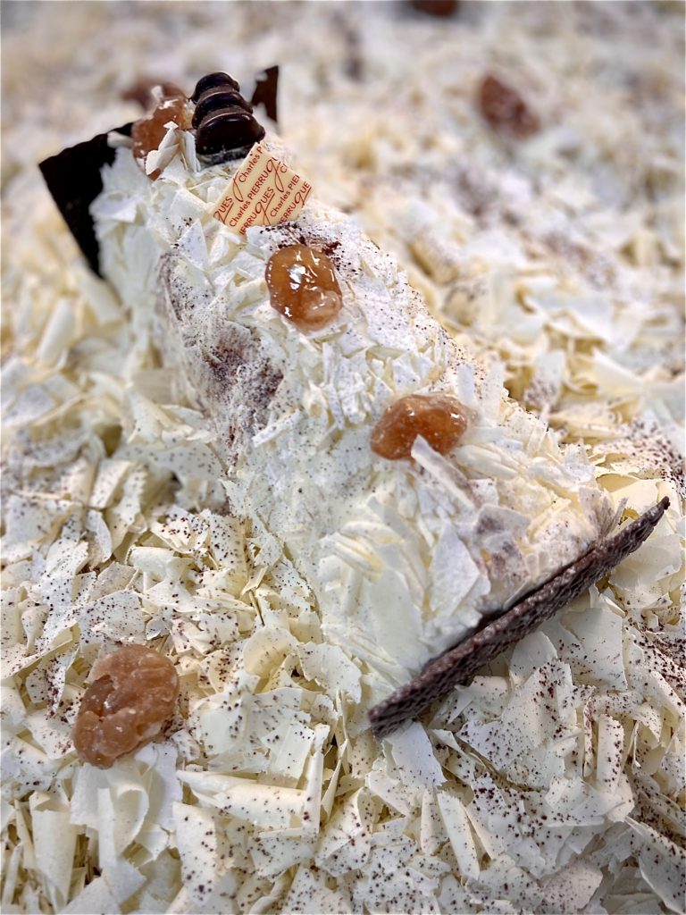 Chantilly aux marrons, brisures de marrons glacés, génoise légèrement parfumée au vieux Rhum.