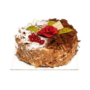 Crème légère chantilly, mousse au chocolat, génoise et flocons de chocolat.