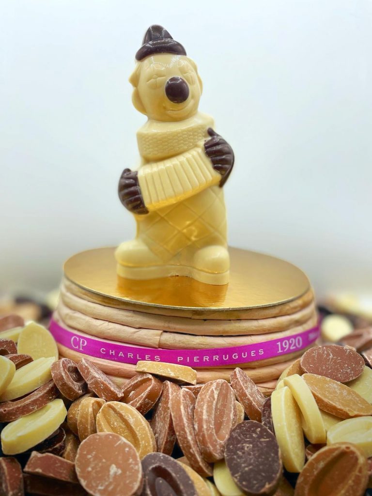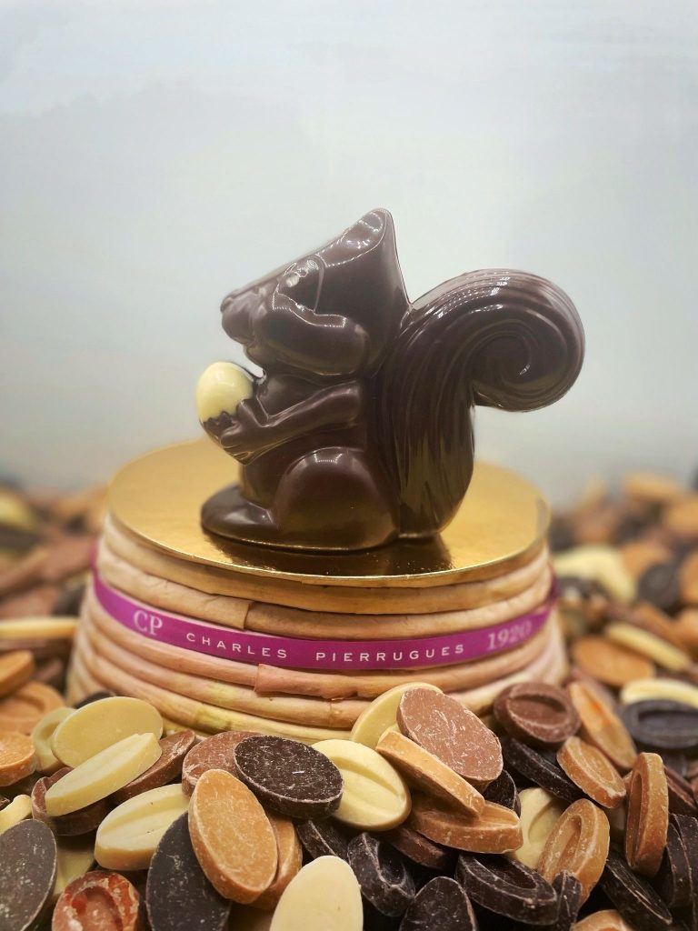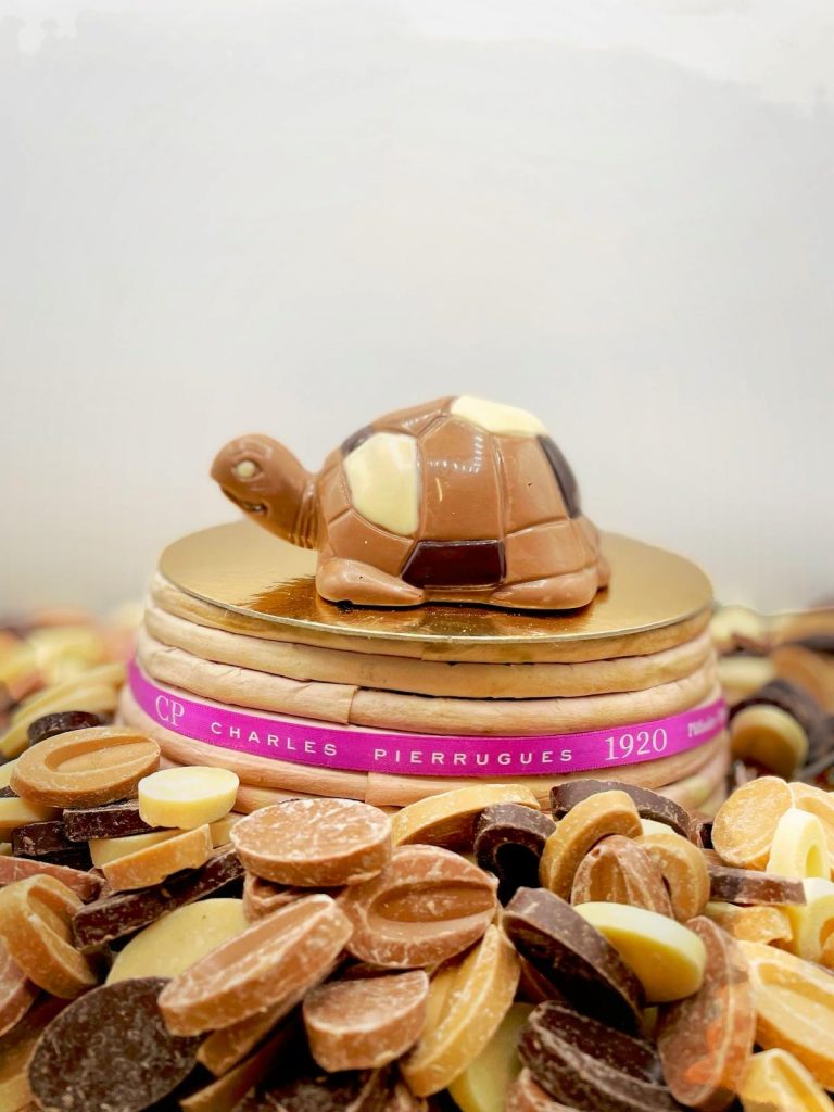 Sujets originaux réalisés en Chocolat 100 % pur beurre de cacao, proposées en chocolat noir, lait, blond ou blanc garnis de fritures de Pâques maison.