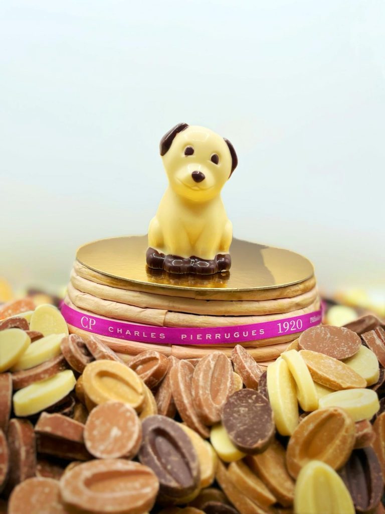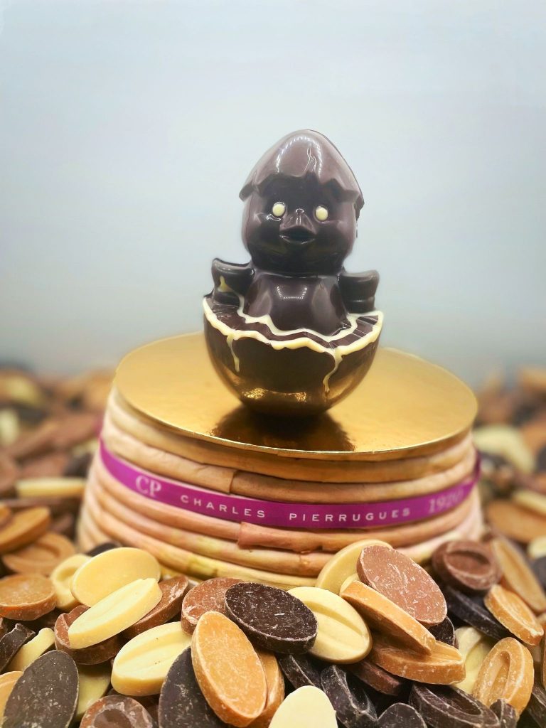 Sujets originaux réalisés en Chocolat 100 % pur beurre de cacao, proposées en chocolat noir, lait, blond ou blanc garnis de petits oeufs sirops.